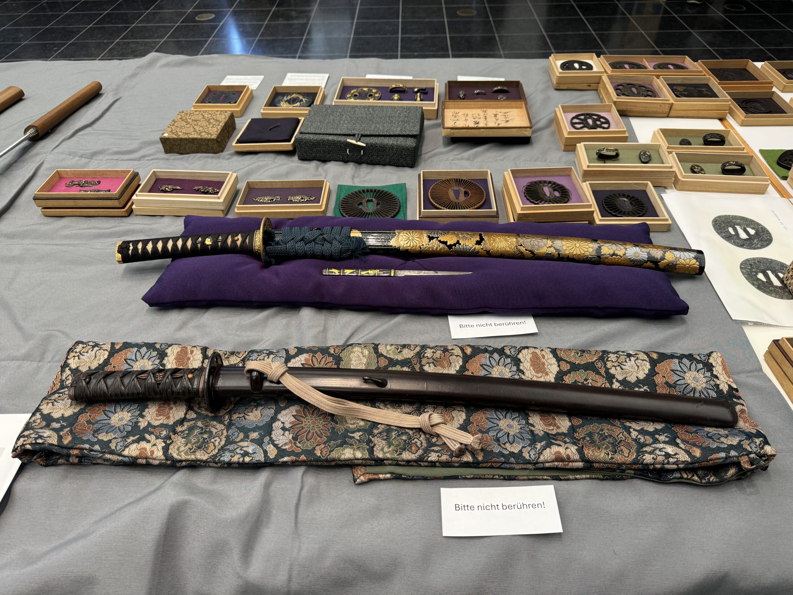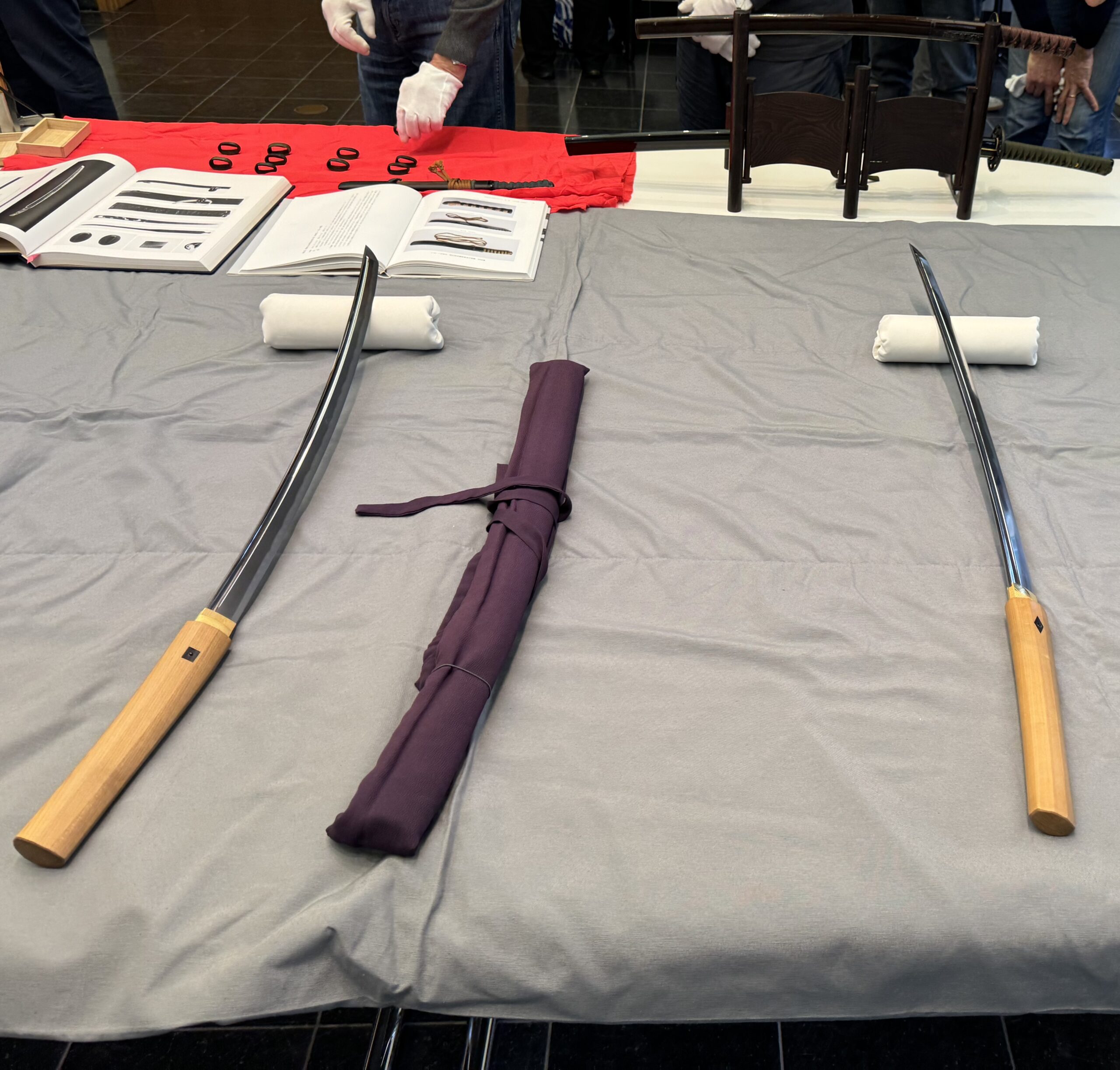 Two koshirae were particularly exciting and rare: Muromachi jidai wakizashi koshirae and a modern utsushimono of the koshirae of the national treasure Nikko Sukezane. The parts of the koshirae are antique, but the assemblage is modern.