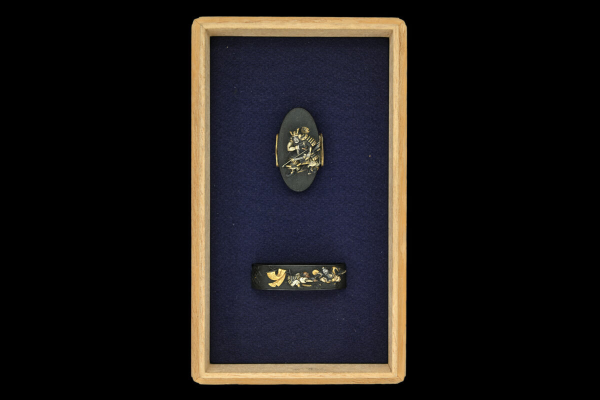 Fuchi Kashira made by Masatoshi, Family name Murakami, active in Kyoto and Osaka at the end of the Edo period. Depicting Samurai in takabori on a shakudo-nanako ground.