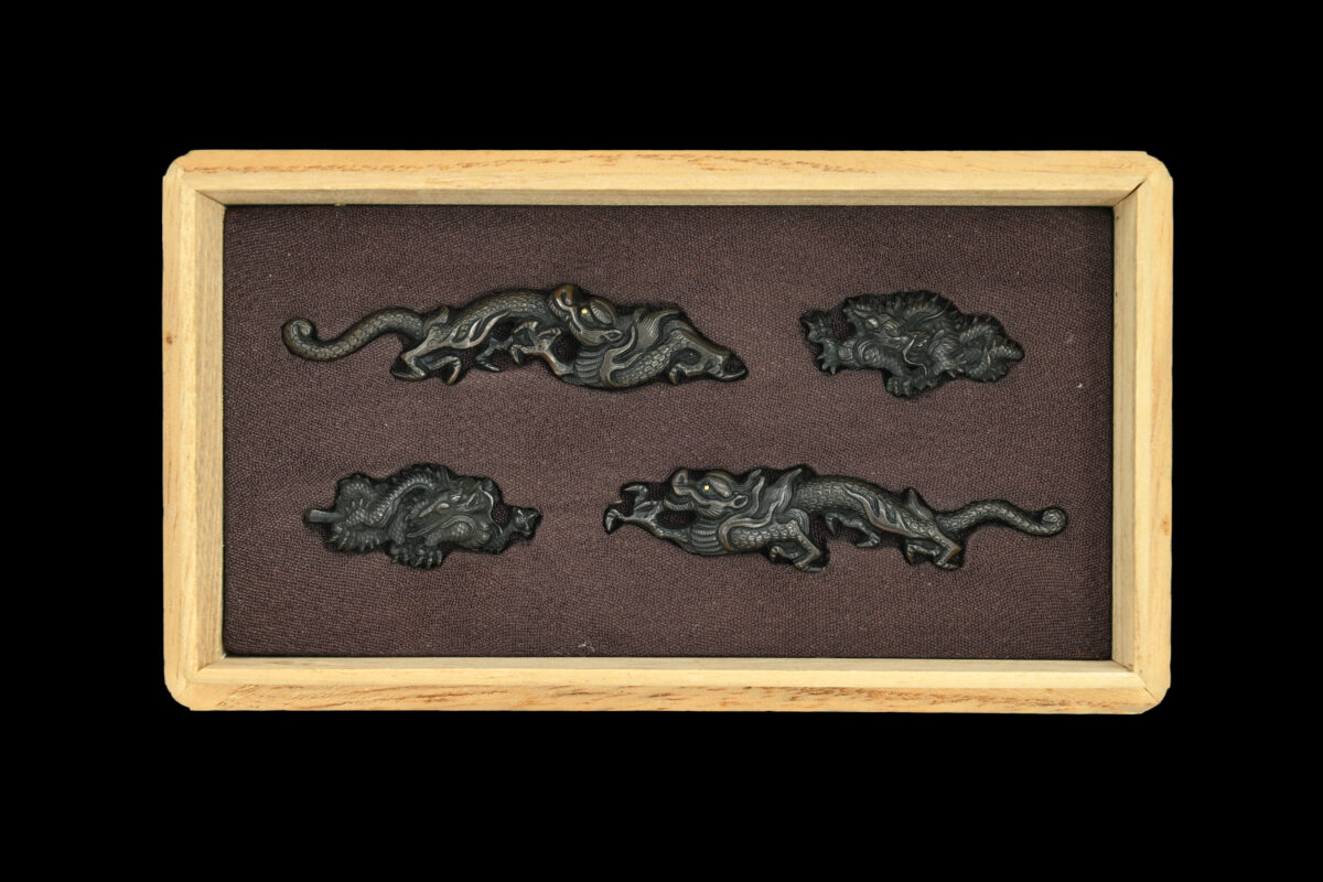 However, since they are presented in a high-quality, custom-made box, and there is a possibility that they were once mounted together on a matching daisho, we will not separate them and will offer them as a beautiful set of daisho dragon menuki.