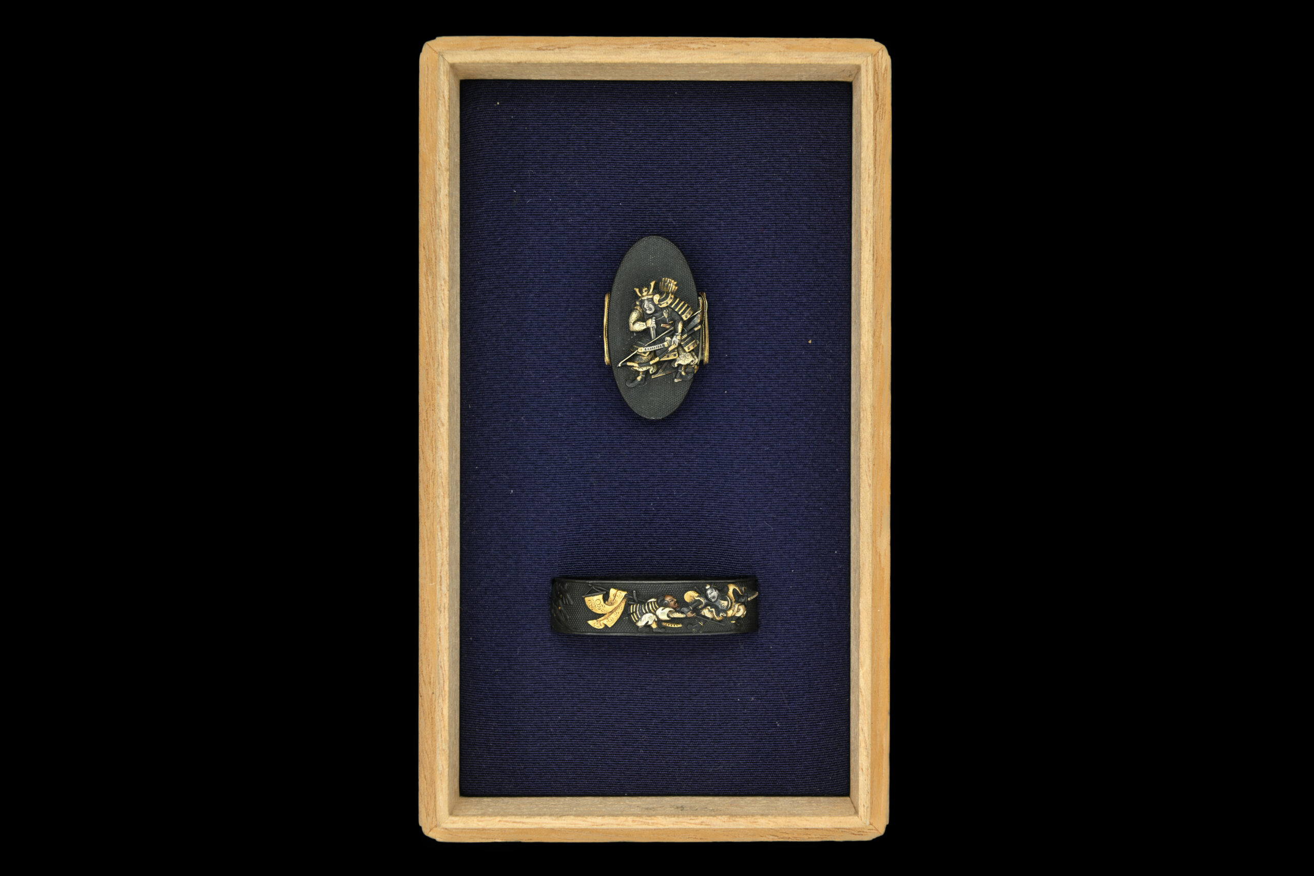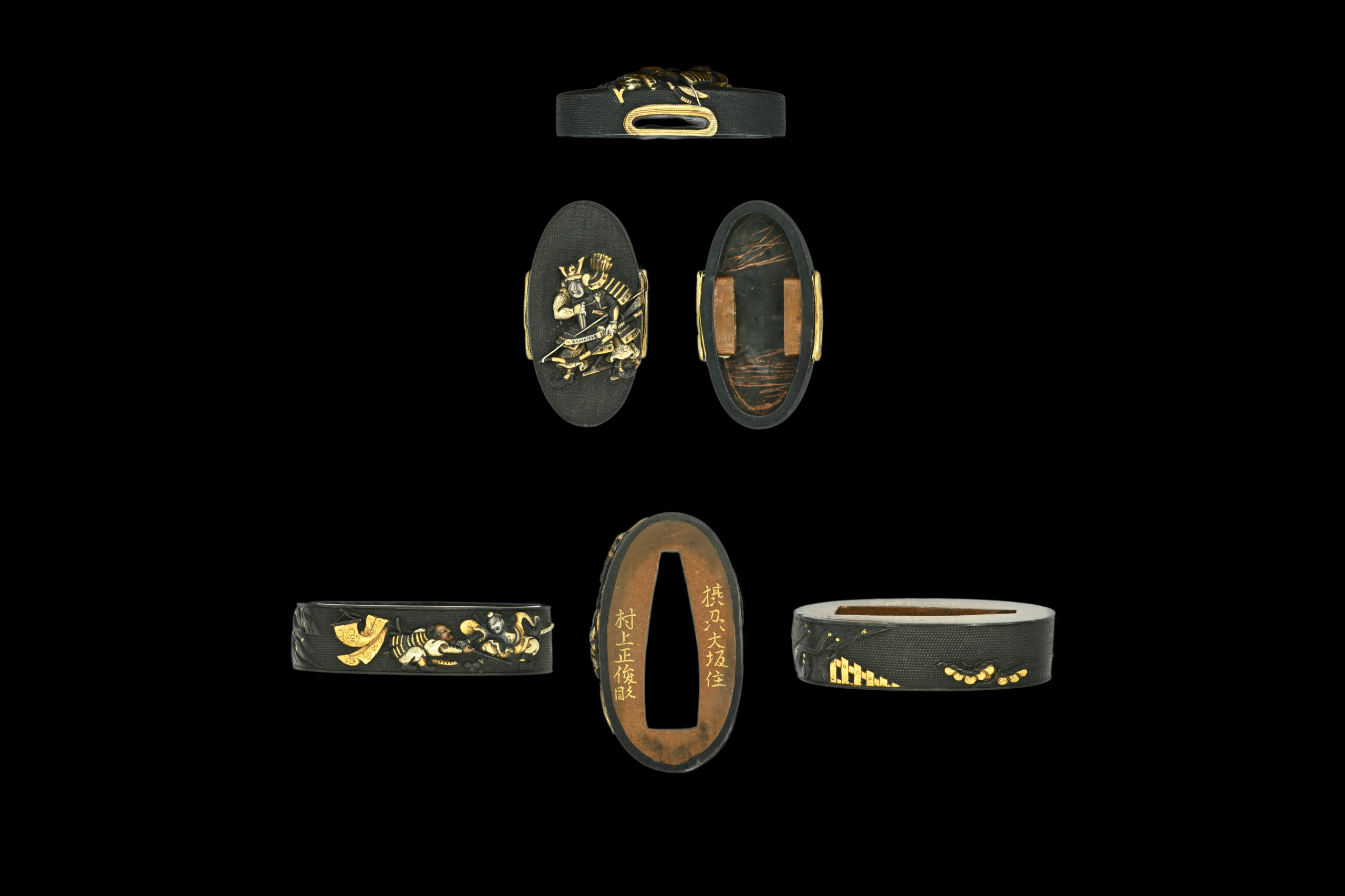Fuchi Kashira made by Masatoshi, Family name Murakami, active in Kyoto and Osaka at the end of the Edo period. Depicting Samurai in takabori on a shakudo-nanako ground.