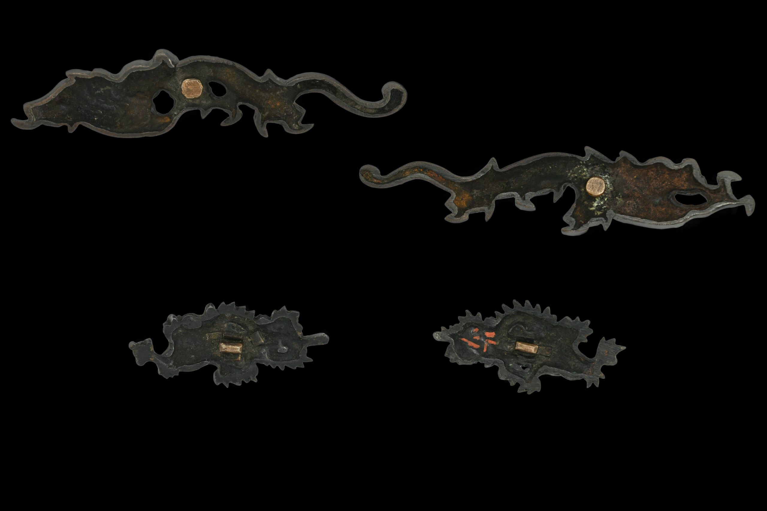 These two pairs of menuki are not considered “true” daisho, as they were not originally made as a set. The NTHK classifies the dai menuki as rain dragons belonging to the Shonai school and the sho dragons to the Waki-Goto school. Furthermore, the Waki-Goto pair appears older, as the NTHK dates them to the mid Edo period, while the dai menuki are attributed to the late Edo period.