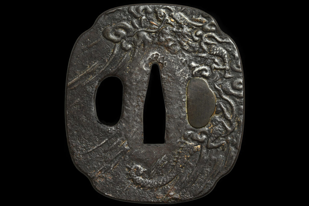 - Dragon with mountain sceneryTsuba: Dragon with mountain scenery Signature/mei: unsigned/mumei Material: iron, shakudo, gold, copper Dimension(h/w/d): 70.0 x… Read more: Dragon with mountain scenery
